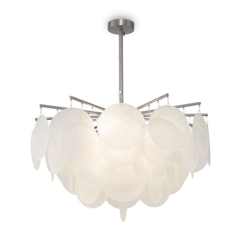Холодная красота серии Porto – заслуга нетривиального декора, выполненного в виде тонких округлых пластин с эффектом замороженного стекла цвета рисовых полей. Теплый свет, проходя сквозь фактурную поверхность, создает атмосферу с настроением щедрого ардеко. Металлическая арматура в двух оттенках – латунь и никель – имеет элегантные, утонченные формы. Сочетание тонко очерченных рожков и воздушного стеклянного декора создает эффект парения. Светильник словно замирает в воздухе, образуя своеобразную визуальную иллюзию. Яркая модель подойдет для комнат, оформленных в стиле ардеко, модерн, неоклассика. Серия включает люстры разных размеров на 6 и 8 ламп. Все светильники снабжены цоколем Е14.