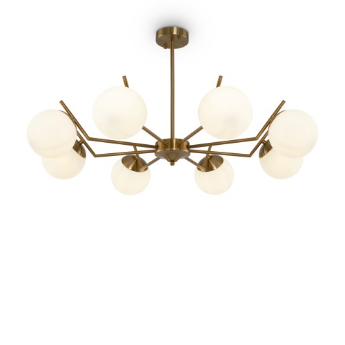 Обращение к природным формам наполняет современный дизайн глубоким смыслом. Визуальный образ – вдохновение для серии Moon – это лунный диск, символ изменчивости окружающего мира. Строгая геометрия металлической арматуры подчеркнута оттенком латуни. Стеклянные плафоны-сферы, окрашенные в матовый белый цвет, смотрятся легко и утонченно. Компактные потолочные модели подойдут для невысоких потолков. Серию составляют люстры, рассчитанные на 6 и 8 ламп. Они прекрасно интегрируются в пространство гостиной, спальни или кухни. Используйте их в интерьерах, выполненных в актуальных стилях: mid-century modern, сканди, минимализм.